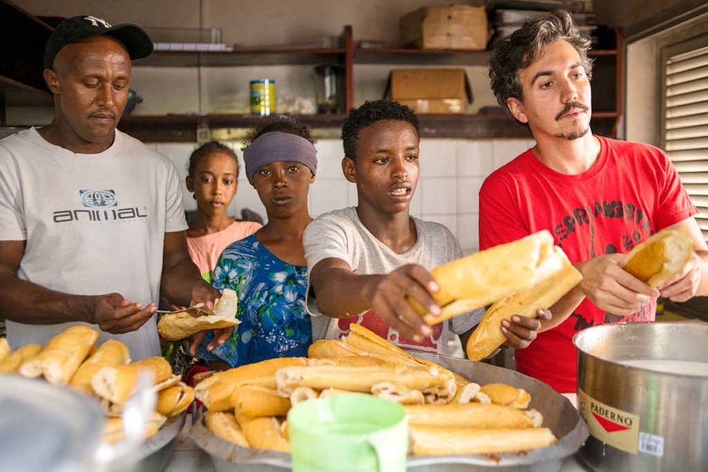 Volunteers and migrant children prepare lunch at Caritas Djibouti’s day shelter.